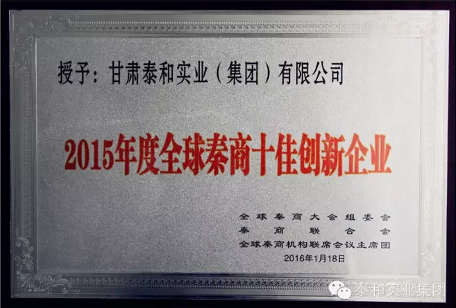 甘肅泰和實業(yè)(集團)有限公司摘得"2015年度全球秦商十佳創(chuàng)新企業(yè)",此獎表彰企業(yè)自主創(chuàng)新、產(chǎn)業(yè)轉(zhuǎn)型和管理創(chuàng)新方面的突出成就!