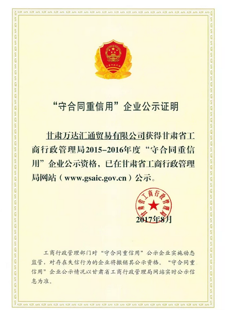 日前,甘肅省工商行政管理局對(duì)2015年—2016年度“守合同重信用企業(yè)”進(jìn)行了公示。甘肅泰和實(shí)業(yè)(集團(tuán))有限公司旗下甘肅萬(wàn)達(dá)匯通貿(mào)易有限公司(以下簡(jiǎn)稱(chēng)“萬(wàn)達(dá)匯通”)憑借良好的企業(yè)信譽(yù),獲得了2015年—2016年度甘肅省“守合同重信用”企業(yè)榮譽(yù)稱(chēng)號(hào)。