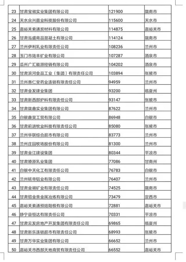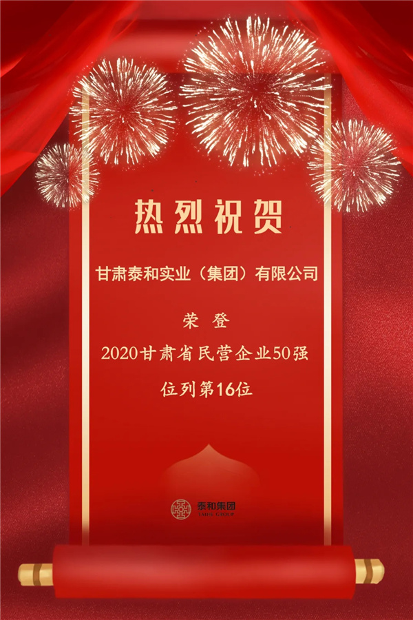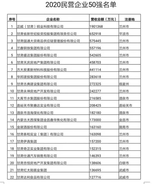 2020年,甘肅省工商聯(lián)對全省范圍內(nèi)2019年度營業(yè)收入1000萬元以上的民營企業(yè)進行調(diào)研,經(jīng)過收集、整理、核驗憑證、數(shù)據(jù)分析,評選出2020甘肅省民營企業(yè)50強。4月13日上午,甘肅省工商業(yè)聯(lián)合會(民間商會)十二屆五次執(zhí)委會議上發(fā)布了2020甘肅省民營企業(yè)50強名單,我司榮登榜單,位列第16位。