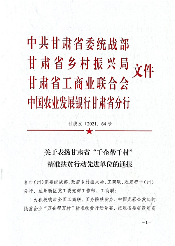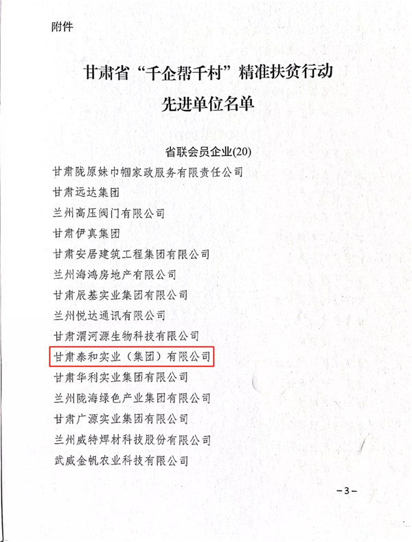 近日,甘肅省委統(tǒng)戰(zhàn)部、甘肅省工商聯(lián)、甘肅省鄉(xiāng)村振興局、農(nóng)發(fā)行甘肅分行發(fā)布《關(guān)于表揚(yáng)甘肅省“千企幫千村”精準(zhǔn)扶貧行動先進(jìn)單位的通報》,對參與我省“千企幫千村”精準(zhǔn)扶貧行動表現(xiàn)突出的273家民營企業(yè)和商會組織予以通報表彰,甘肅泰和實(shí)業(yè)(集團(tuán))有限公司榮獲甘肅省“千企幫千村”精準(zhǔn)扶貧行動“先進(jìn)單位”稱號。